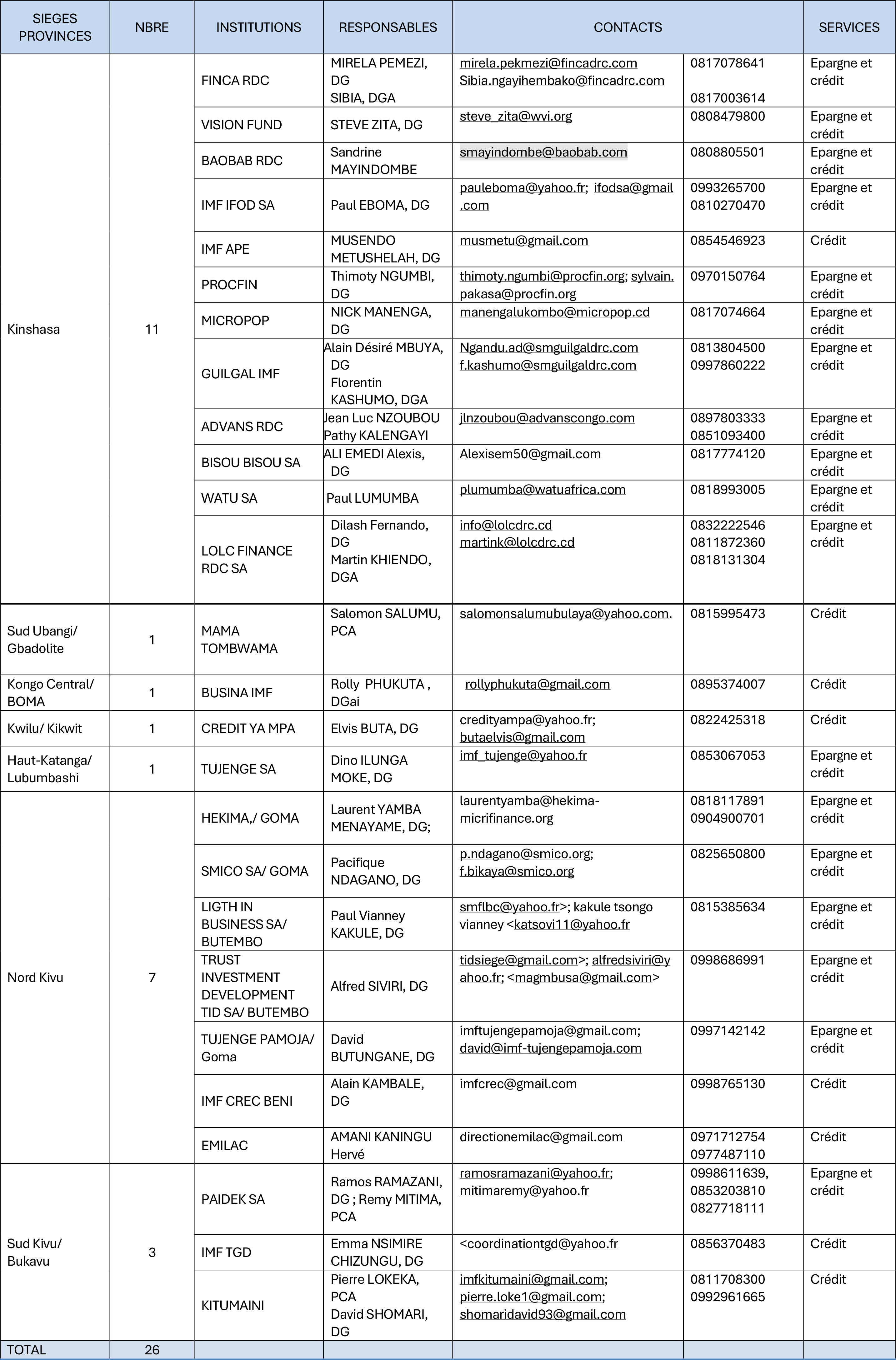 Voici la liste actualisée des membres qui composent l'Association Nationale des Institutions de Microfinance en République Démocratique du Congo, A ...